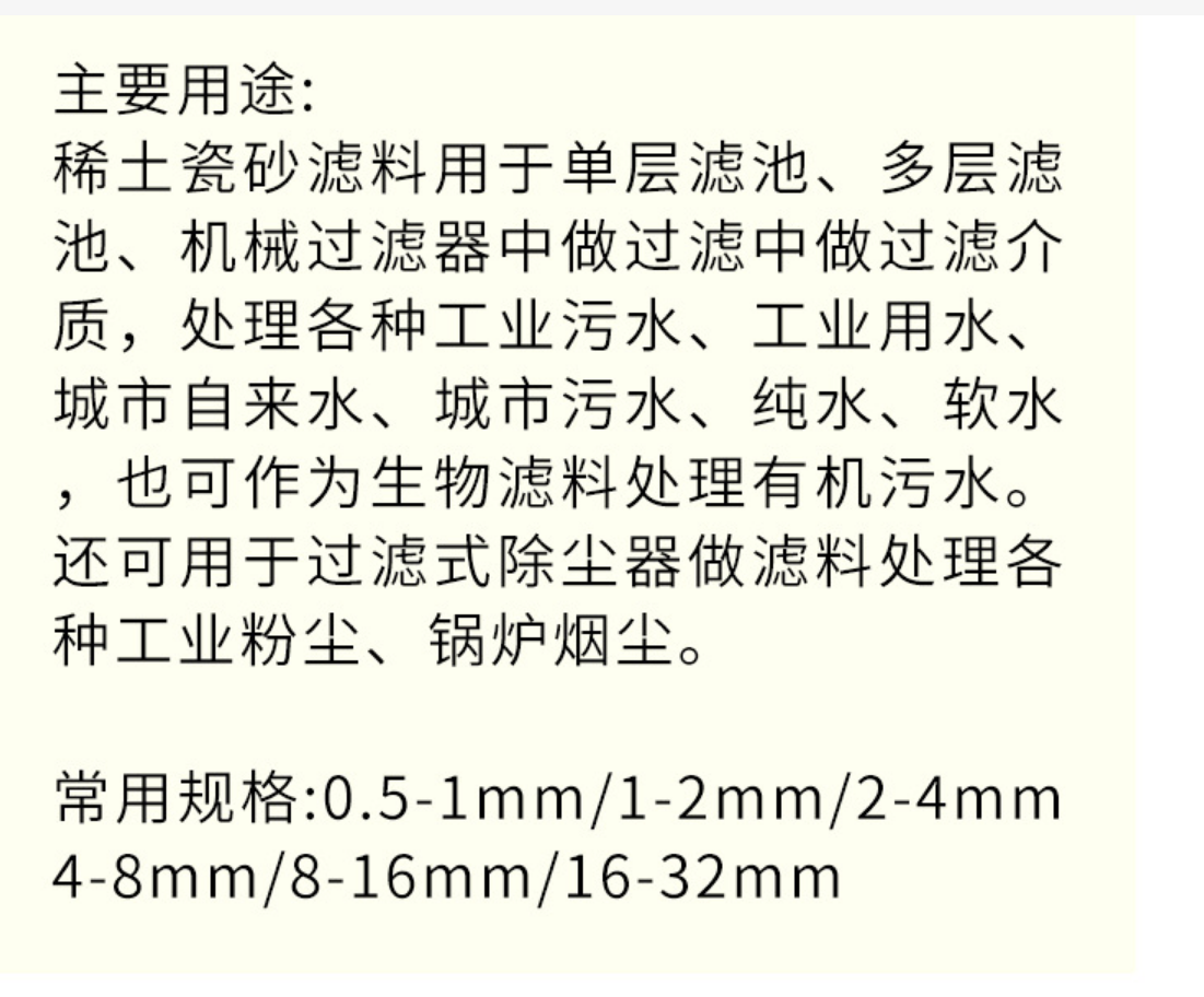 稀土瓷砂濾料廣泛用于濾池,有效的處理各種進(jìn)水和污水,還可以用于煙氣除塵器中做濾料,過(guò)濾除去各種工業(yè)粉塵和鍋爐煙塵。